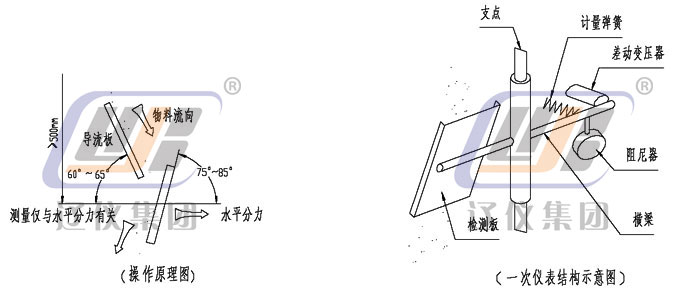 干燥的散裝固體物料自由落體沖擊到傳感檢測板(沖板)上后,傳感檢測板產生機械偏移。然后散裝物料流連續而無阻礙的通過。即:由于沖擊力與傳感檢測板具有一定角度,故該力分解成一個水平分力和一個垂直分力。垂直分力由變送器的機械結構克服而不起作用,而水平分力有一個差動傳感器(線性可調差動變送器),這個信號經與之相連的積算儀檢測和處理,得出瞬時流量和累積流量。